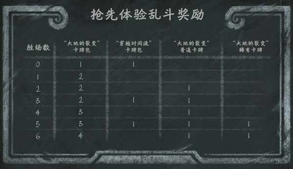 所有玩家将获得一次免费参加抢先体验乱斗的机会。此后的每次参赛需要花费2张旅店通票、300金币或24符文石。每轮比赛中,你将固定使用一副套牌,直到获得6胜或3败为止。最后根据你的表现,还可以赢得新卡牌作为奖励!
