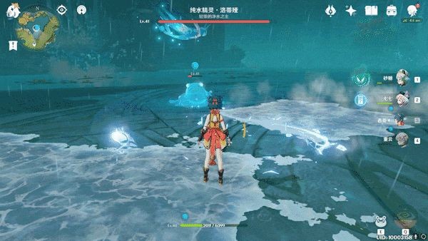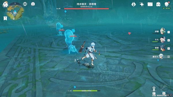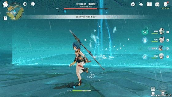 纯水精灵作为一个比较特殊的boss,其战斗基本都是与上述的水之幻形进行,由于水之幻形自身为水属性,所以身上会持续附着水元素,我们可以利用这点使用冰元素的角色对其造成冰冻效果后进行输出或者直接用雷属性角色造成长时间感电伤害进行范围输出。