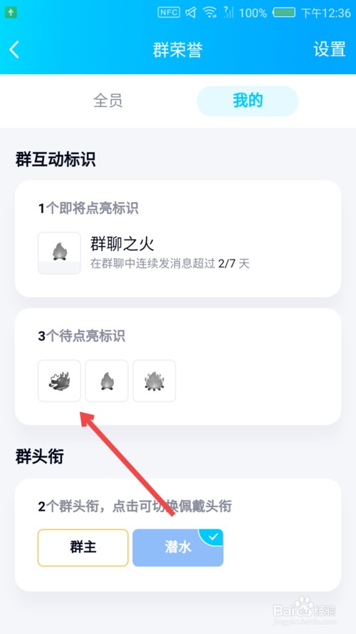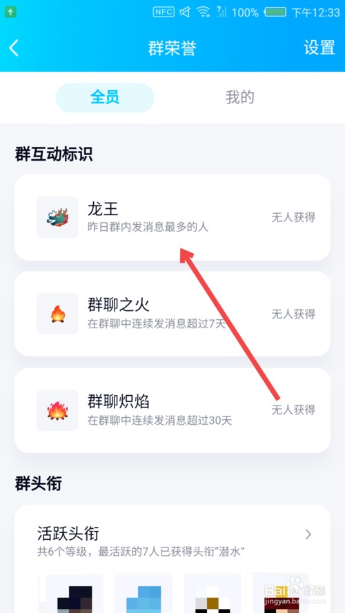 3、点击“群荣誉”,可以看到“昨日群内发消息最多的人”可以获得龙王标识。