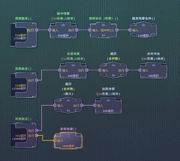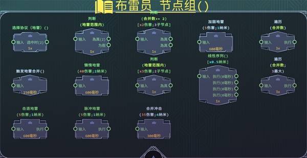 核心节点有触发地雷合并和复制地雷等,触发地雷合并可以使地雷附加所有的属性,复制地雷可以直接复制一个最近的地雷。