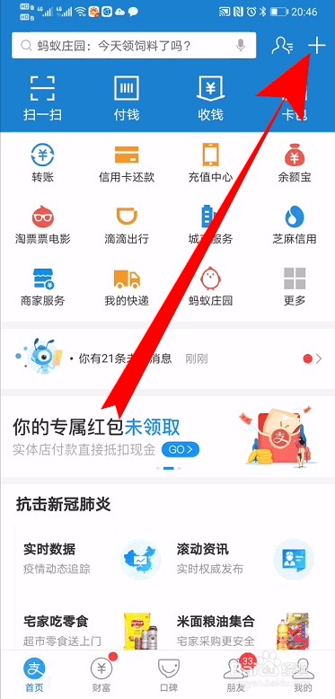 返回支付宝首页,点击右上的+号。