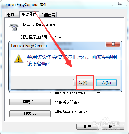 7.在弹出的小窗口中,再单击【是】按钮,就可以禁用摄像头了。