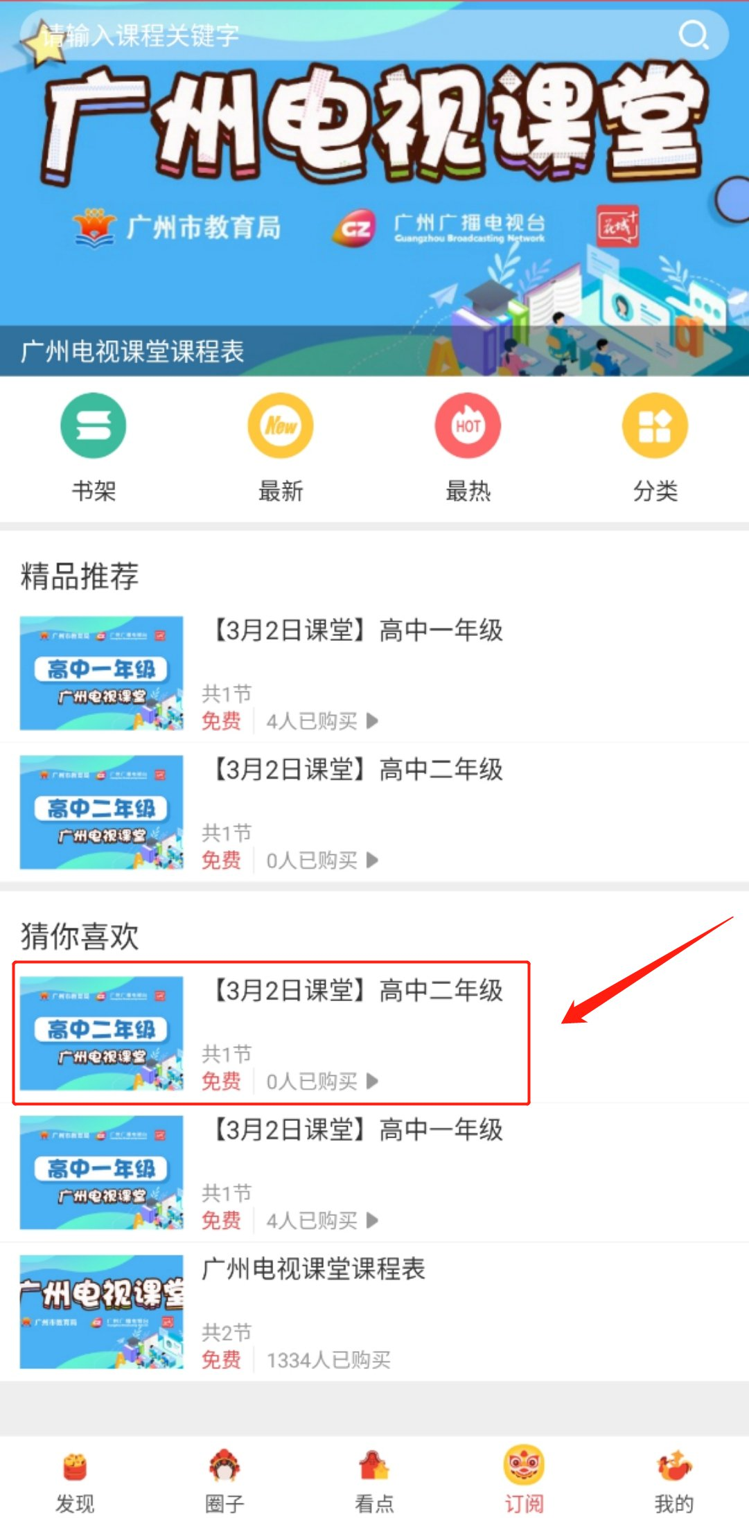 第三步:进入课堂后,可看到最新课程列表,选择所在年级