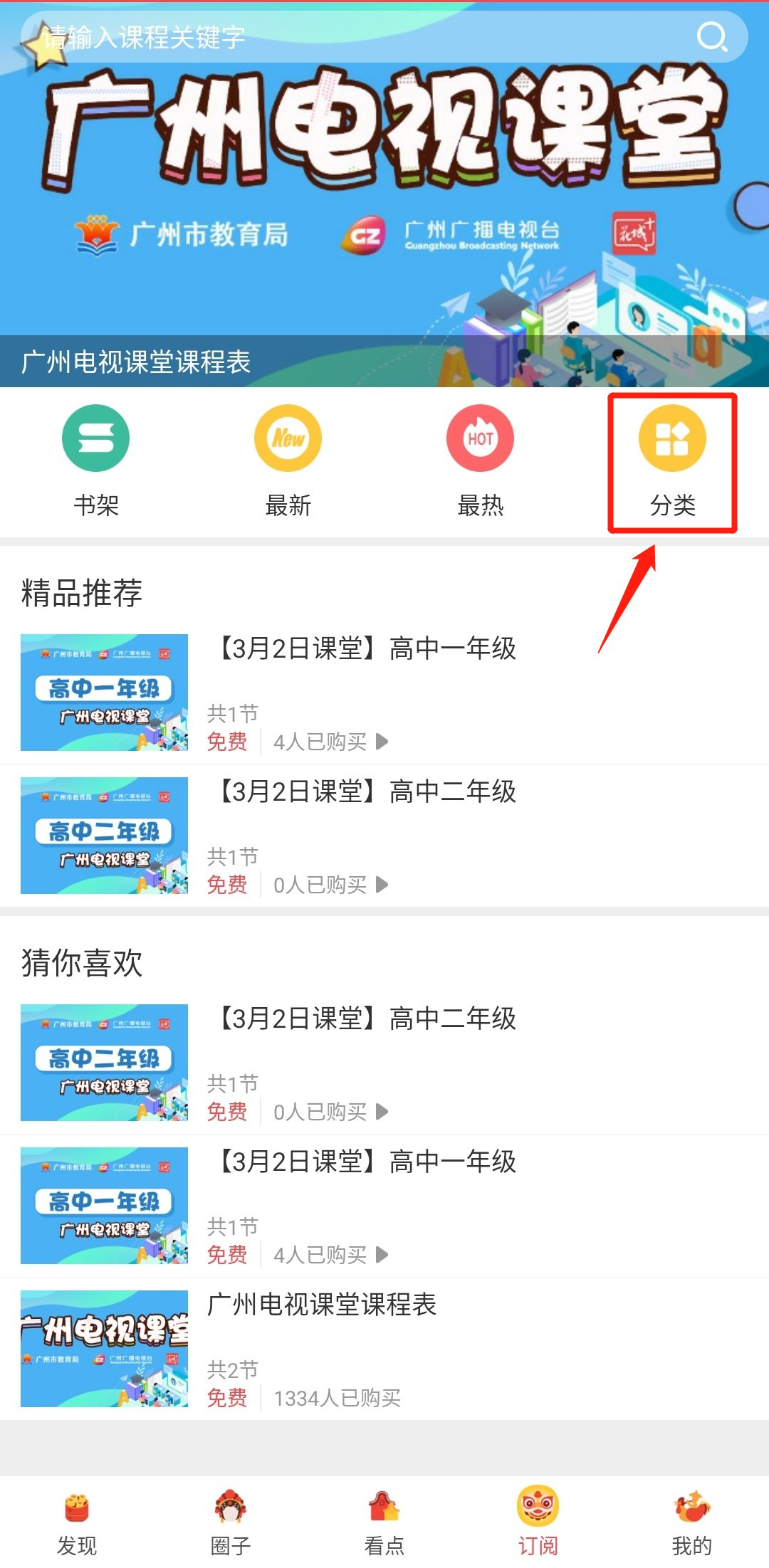 第一步:点击页面中“分类”,查看各年级全部课程