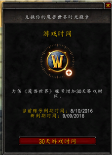 兑换前,系统将提示您当前账号剩余的游戏时间和兑换后的时间。确认兑换请点击【30天游戏时间】并【接受】注意:未接受前时光徽章仍处于您的行囊内,可随时终止兑换,为《魔兽世界》账号兑换30天游戏时间成功,您可以通过战网通行证管理查看到充值记录。