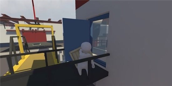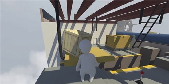 在集装箱的右侧有一个悬空一半的铁梯,上面放置着一个木箱,跳过去抓住铁梯,铁梯失衡后砸落下来,木箱也掉落到地面。