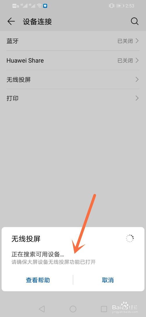我们需要打开大屏设备的无线投屏功能,然后会自动搜索连接,配对连接成功后就可以把手机的影像同步到大屏幕上。