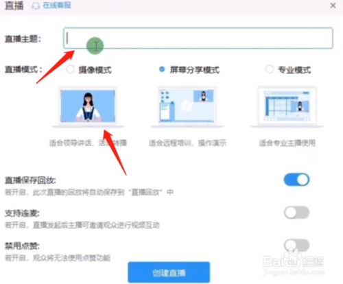 输入直播主题,在下方可以选择模式,摄像模式、屏幕分享模式、专业模式等,点击创建直播。如图所示