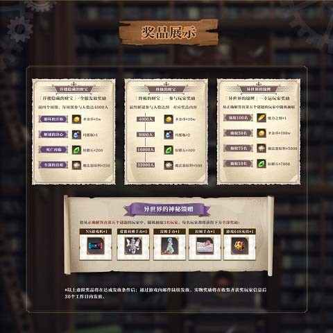 各位侦探参与每期解谜,达成一定人数可以获得当期对应奖励。全部奖品包括:前四个周期每期的解谜参与人数达成奖【洋楼隐藏的财宝】;参与第五个周期的侦探们能够获得的【终极的财宝】;从参与第五个周期解谜的侦探中,抽选出的部分正确解谜幸运玩家获得【异世界锦鲤】奖;和在参与第五个周期解谜的侦探中产生出的三位最幸运侦探获得【异世界的神秘礼物】奖